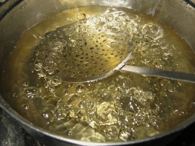Zet het vuur aan en zet een pan water op het vuur. Wanneer het water begint te koken, giet het dan heel voorzichtig in de pot, zodat de container niet barst. We bedekken de pot met een deksel en laten de naden 10 minuten met rust.