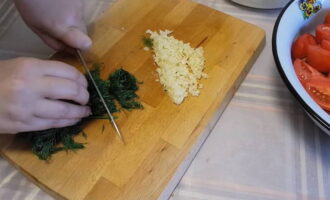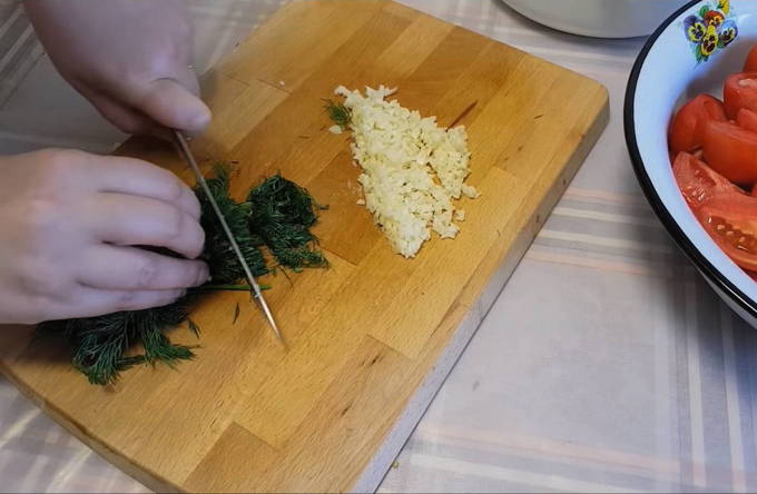 - Snijd vervolgens de knoflookteentjes en de dille.