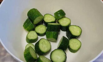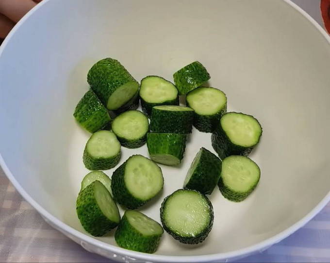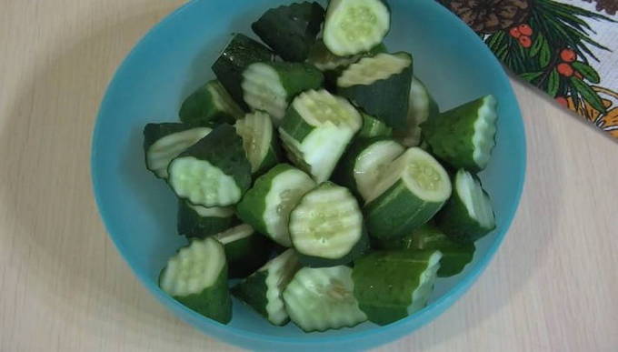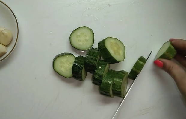 - Snijd de voorgeweekte en gewassen komkommers in kleine cirkels.