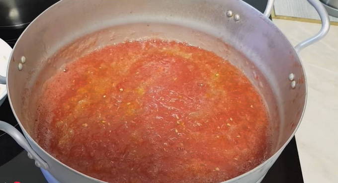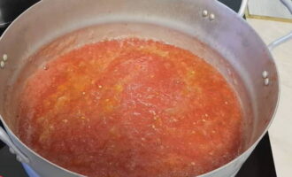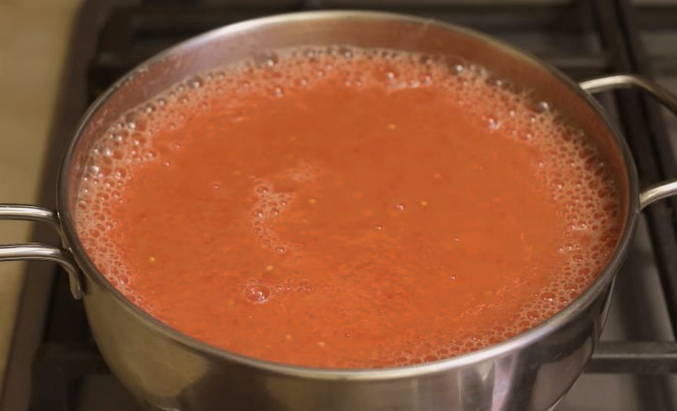- Giet zout, suiker, tafelazijn bij een homogene tomatenmassa en breng aan de kook.