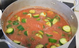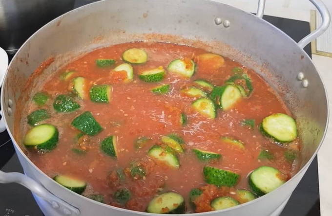 - Voeg daarna komkommers toe en kook ongeveer 10 min. Met elke minuut wordt de tomatensaus een beetje dikker en dichter.