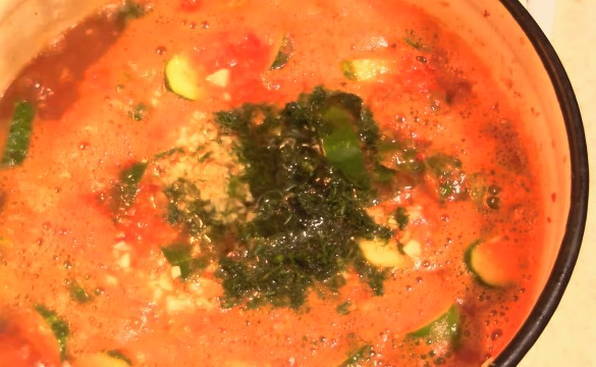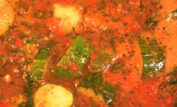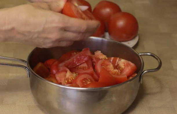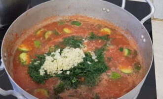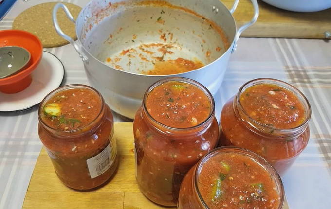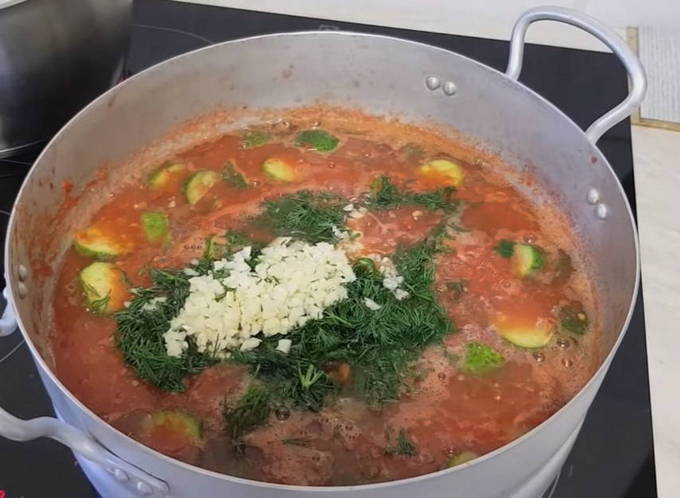 - Gehakte knoflook, dille, in kokende tomatenmassa gedaan, plantaardige olie erin gieten en 5 minuten koken.