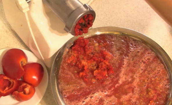 Haal de tomaten met paprika door een vleesmolen en breng op laag vuur aan de kook. Voeg vervolgens zout toe, meng en kook gedurende 15 minuten.