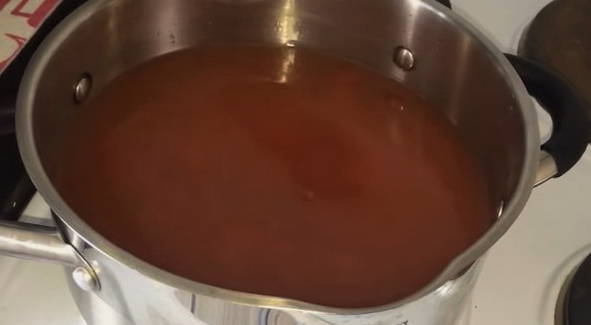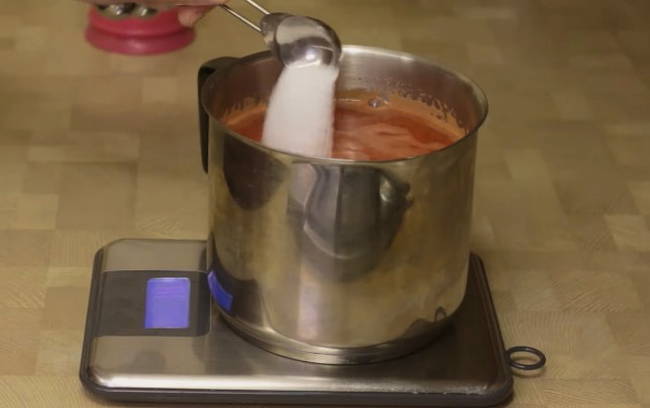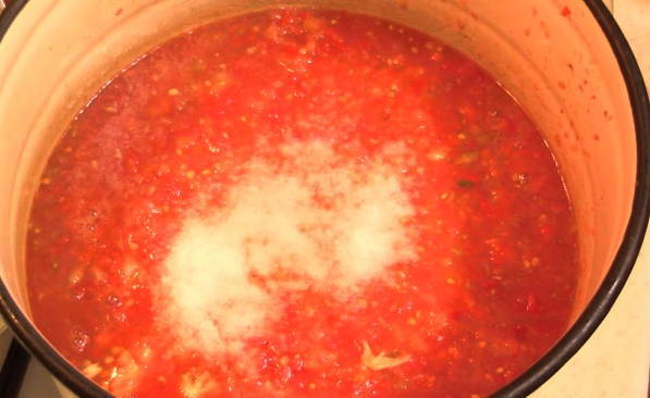- Voeg 50-60 gram zout per liter sap toe en meng goed. We sturen de tomatenmassa op laag vuur totdat het zout volledig is opgelost en het schuimen stopt.