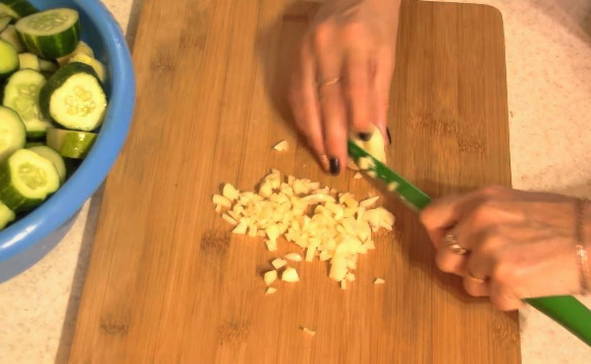 De eerste stap is om alle groenten te bereiden. We wassen de komkommers en laten ze weken. Tegelijkertijd verspillen we geen tijd, maar malen we de knoflook met dille.
