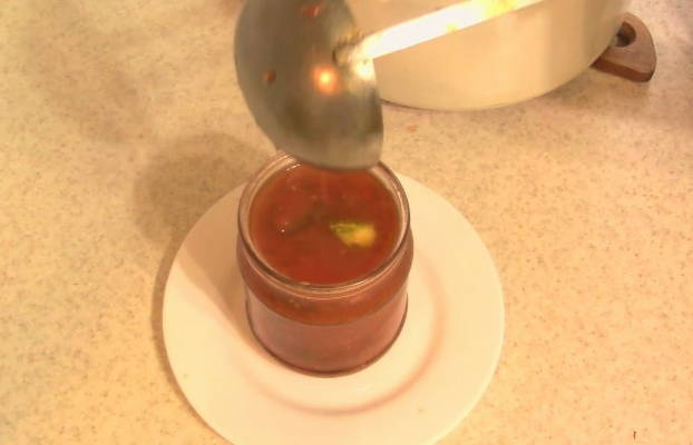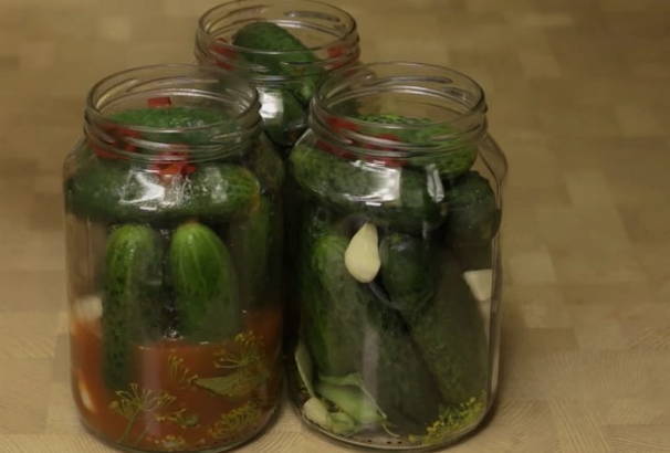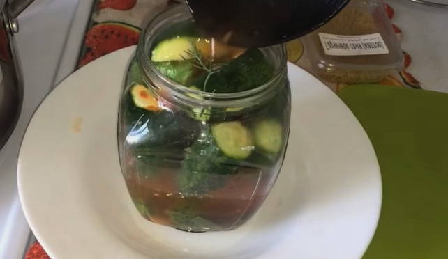 - Giet komkommers in een tomaat in gesteriliseerde potten en rol de deksels op.