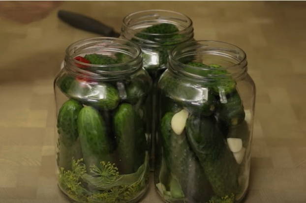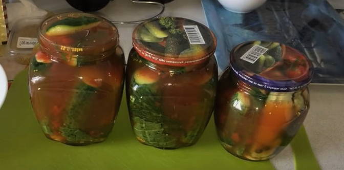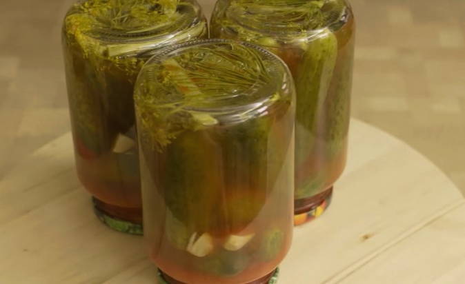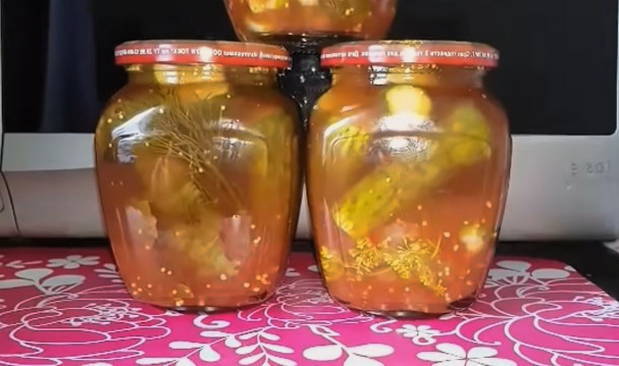 - Giet het water uit de blikken en giet de hete marinade erbij. Rol de komkommers op met voorbereide deksels en laat ze volledig afkoelen onder een handdoek.