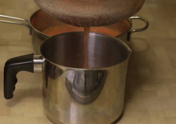 - Zeef het gekookte sap door een zeef om de gehakte tomatenschillen zoveel mogelijk te verwijderen.