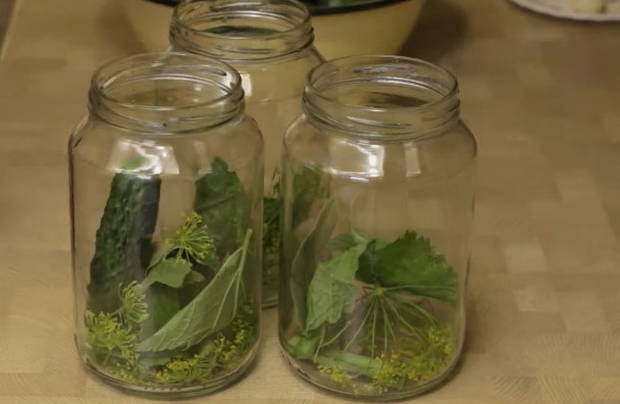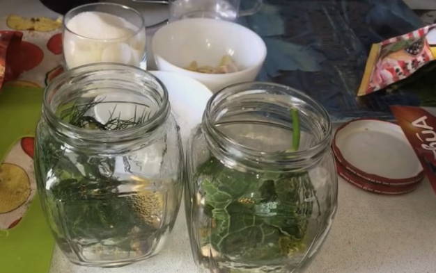 - Voeg dilleparaplu's, peper, laurierblaadjes en andere groenten toe aan de bodem van de gewassen blikjes. Dan beginnen we de potten te vullen met komkommers.