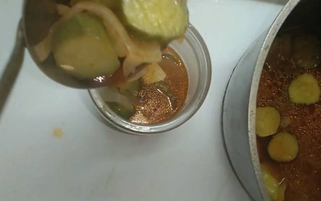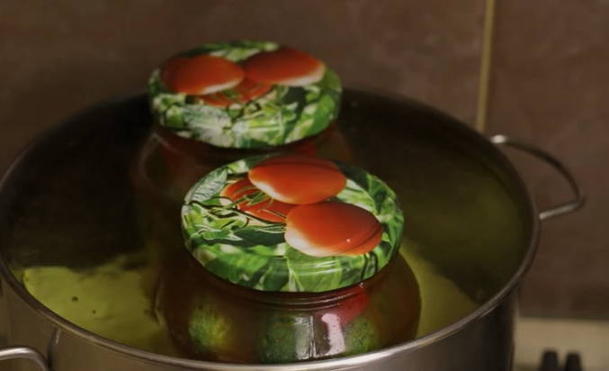 - Giet de komkommers onmiddellijk met hete marinade en vul de pot helemaal tot bovenaan. Bedek de gevulde blikken met deksels en ga verder met het steriliseren van de blikken. Bedek de bodem van een schone pan met een handdoek, zet de blikken buiten en giet wat warm water. Na het koken steriliseren we de potten maximaal 8 minuten.