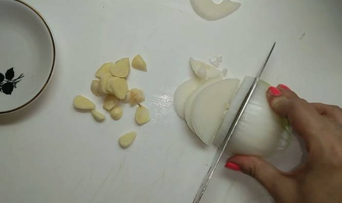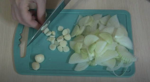 - Snijd de voorbereide ui en knoflook. Niet te kleinzielig.