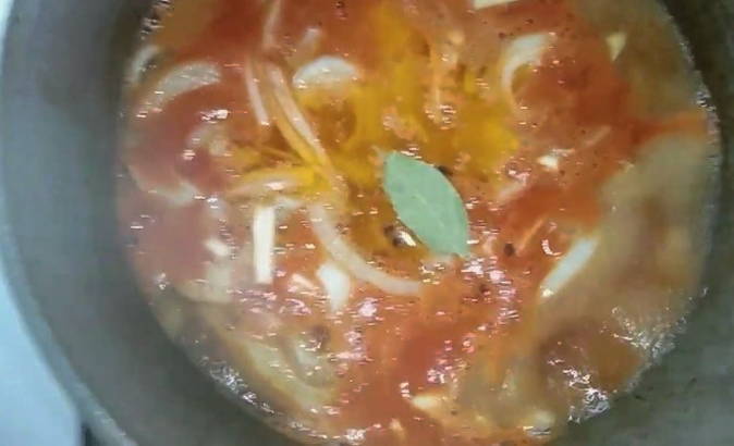 - Gedurende deze tijd zullen we de tomatensaus bereiden. Voeg tomatenpuree, zout, suiker, laurierblaadjes, peper en mosterd toe aan een pan met water. Meng alles goed.