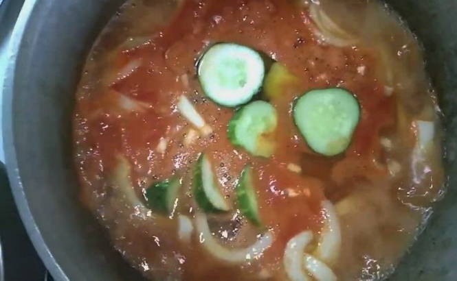 - Combineer water met tomatenpuree en voeg alle ingrediënten toe behalve azijn en komkommers. Nadat de massa aan de kook is gebracht, blijven we nog 15 minuten koken.