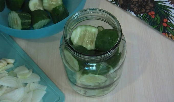 - Leg vervolgens een laag ui en knoflook op de bodem van schone gesteriliseerde potten en leg de komkommers erop. In deze volgorde wisselen we af totdat we de blikken volledig hebben gevuld.