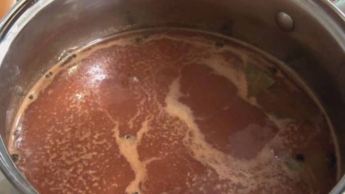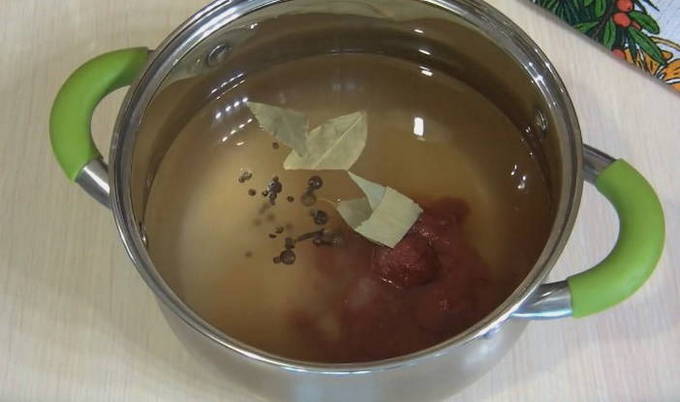 - Laten we beginnen met het bereiden van de marinade. Giet zout, suiker in een liter water en meng goed. Voeg vervolgens azijn en hete ketchup toe. Breng de marinade aan de kook en kook nog 3-4 minuten.