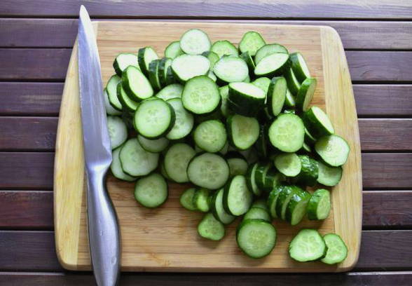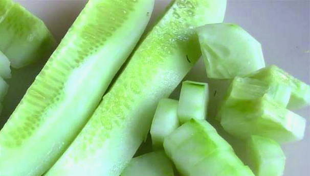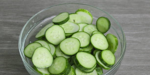 - Giet twee keer kokend water over de komkommers en laat ze 10 minuten onder het deksel weken.