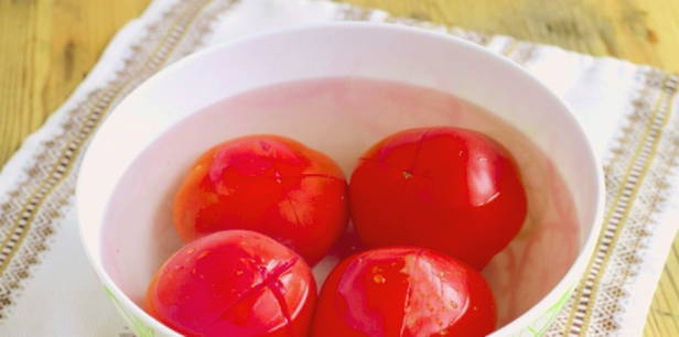 - Was de tomaten, maak er kruisvormige sneden in, dompel ze 5-7 minuten in kokend water. Verwijder vervolgens, beginnend bij de snijwonden, de huid.