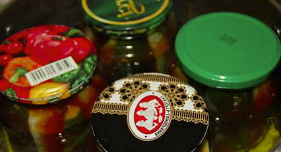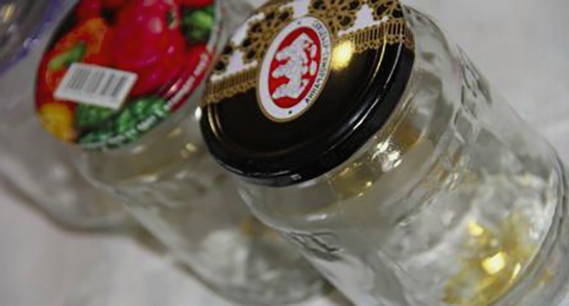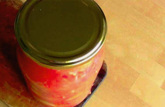 - Komkommerpotten vullen met tomatensaus en sluiten met deksels.