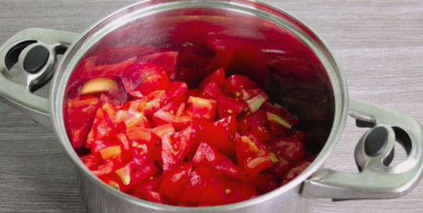 - Was de tomaten en snij ze in kleine blokjes. Breng de tomaten over in een pan, zet ze in brand en kook ze 5-7 minuten, tot ze gepureerd zijn.