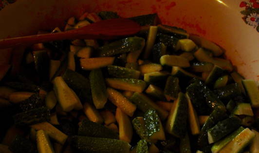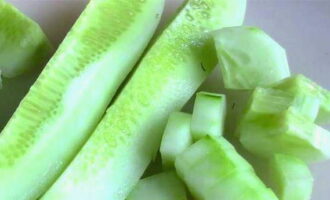 - Was komkommers en snij in vieren. Breng de komkommers over in een pan met tomatenpuree en kook gedurende 20 minuten na het koken.