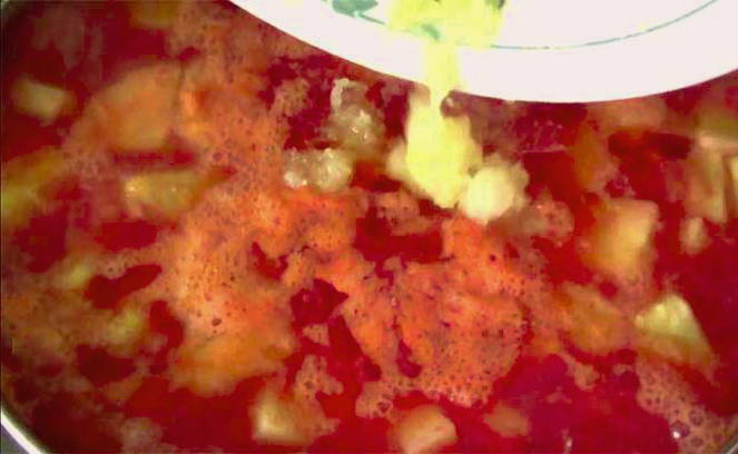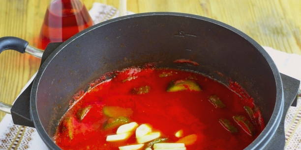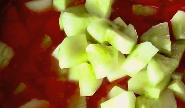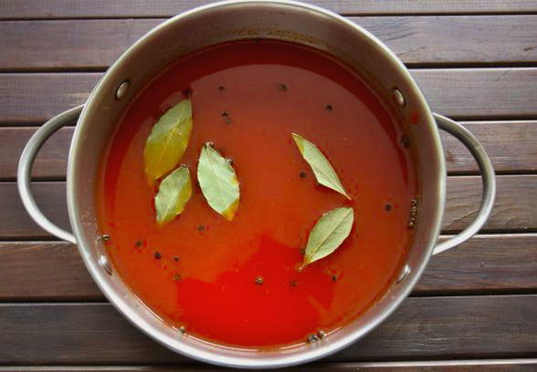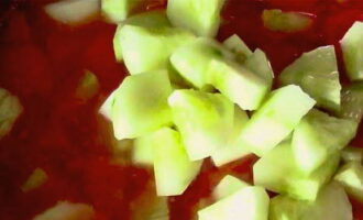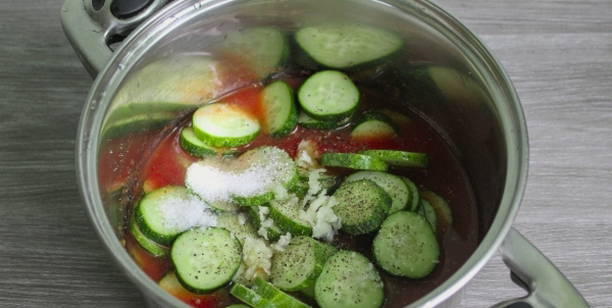 - Was de komkommers en snij in dunne plakjes. Doe ze in tomatensap, roer en kook 10-12 minuten. Voeg vervolgens de gehakte knoflook toe, kook nog 3-4 minuten na het koken.