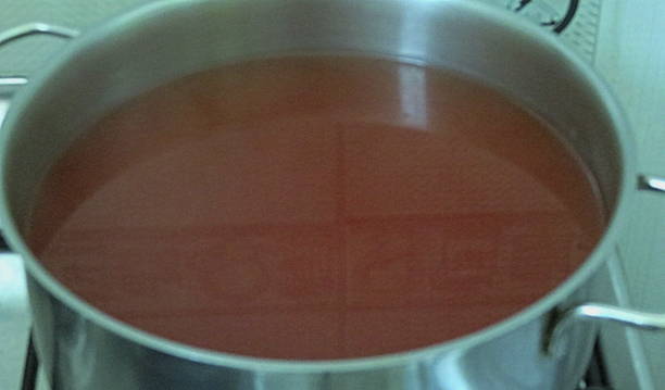 - Breng het tomatensap over in een pan, voeg gehakte komkommers, zout en gehakte knoflook toe.