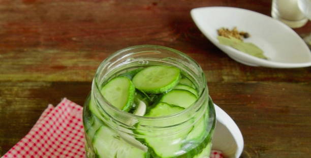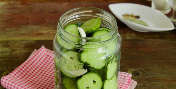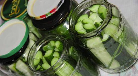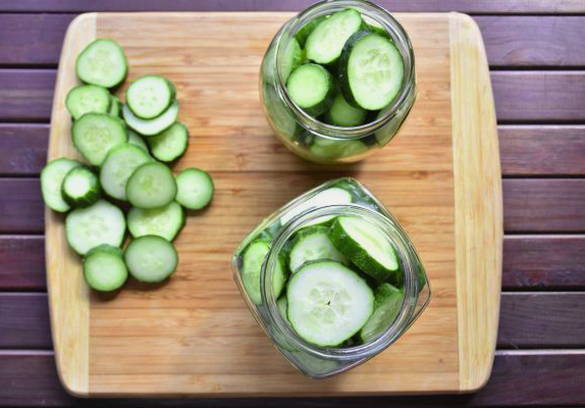 - Schik de plakjes komkommer in gesteriliseerde potten.