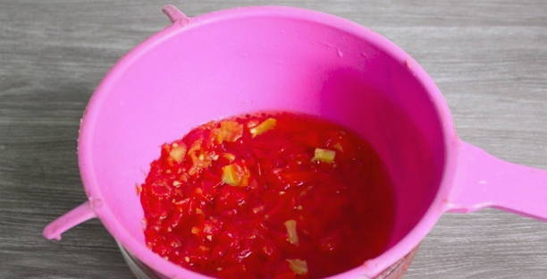 Was eerst de groenten goed, schil de zaadjes van de peper. Haal de tomaten en paprika's door een vleesmolen.