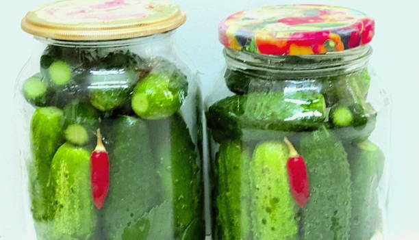 - Verpak de komkommers stevig in gesteriliseerde potten. Voeg de knoflookteentjes toe.