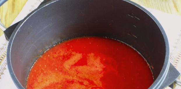 - Giet de hete tomatensaus in de potten, dek ze af met deksels. Steriliseer de blanco's gedurende 10-15 minuten in kokend water.
