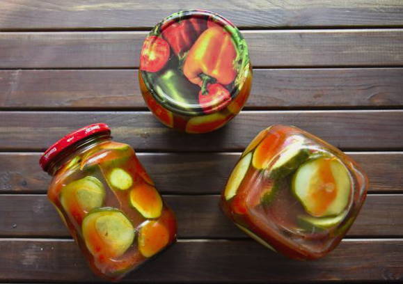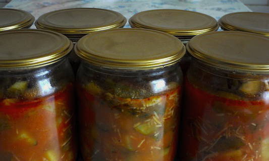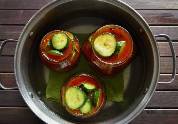 - Bedek de komkommerpotten met deksels en steriliseer ze gedurende 15 minuten in kokend water. Sluit vervolgens de deksels goed af en laat de naden volledig afkoelen. Bewaar komkommers in pikante tomatensaus op een koele plaats.