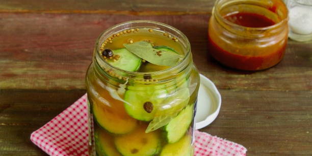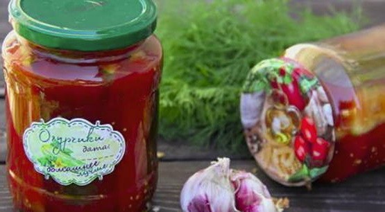 Nu zul je niemand verrassen met gewone ingemaakte komkommers, dus er worden zeer uiteenlopende recepten gebruikt. Hier is een geweldige optie voor knapperige komkommers in een pittige tomatensaus.