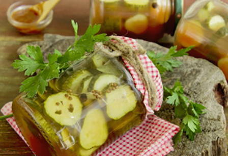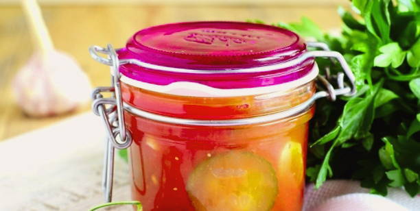 - Schik de met tomaat gevulde komkommers in gesteriliseerde potten en rol ze meteen op met deksels. Bewaar deze heerlijke bewaarsnack op een koele plaats.