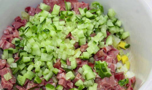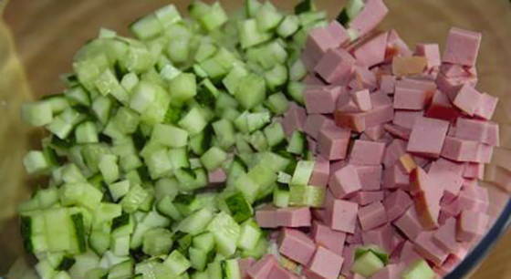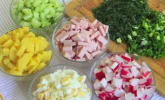 Was de groenten. Snijd radijs, komkommer, aardappelen, eieren en worst in blokjes van ongeveer dezelfde grootte.