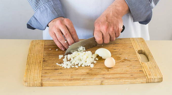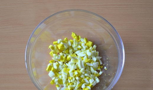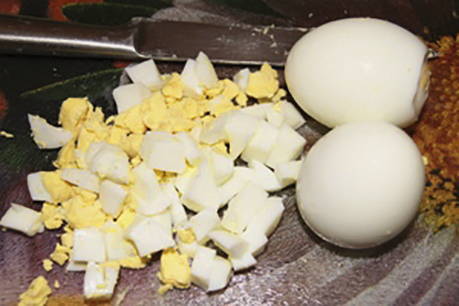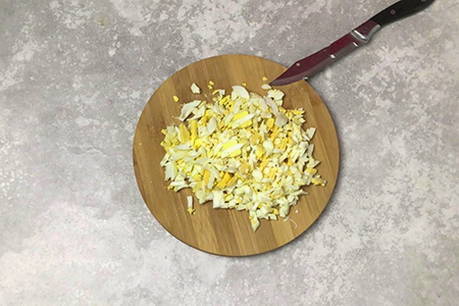 Snijd hardgekookte eieren in blokjes.