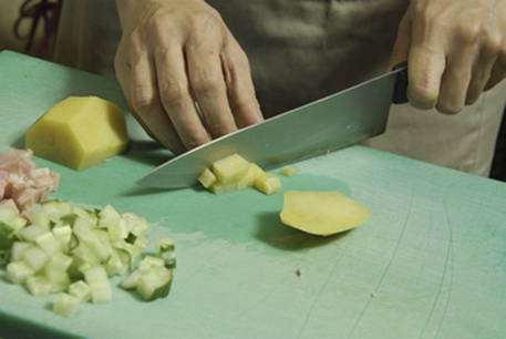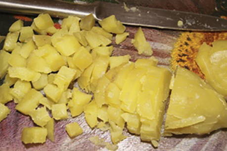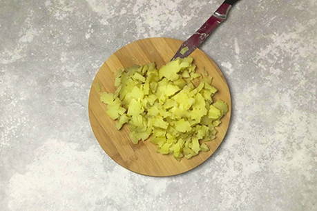 Snijd de gekookte aardappelen in kleine blokjes.