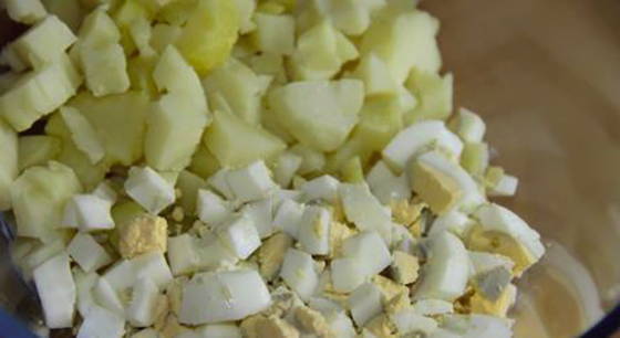 Kook aardappelen en eieren en laat volledig afkoelen. Schil ze daarna en snijd ze in kleine blokjes.