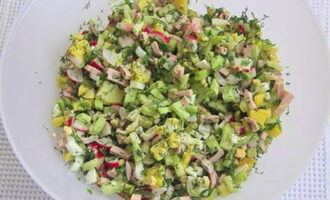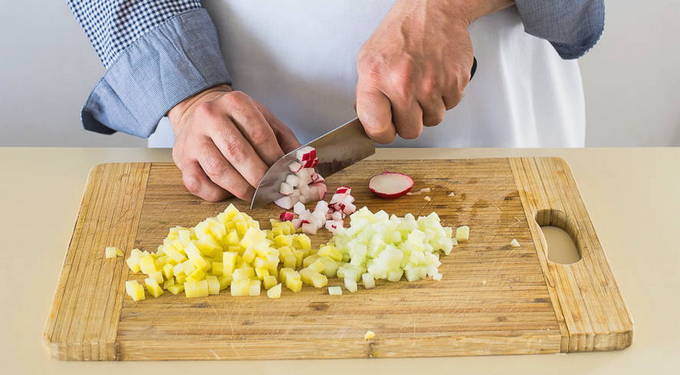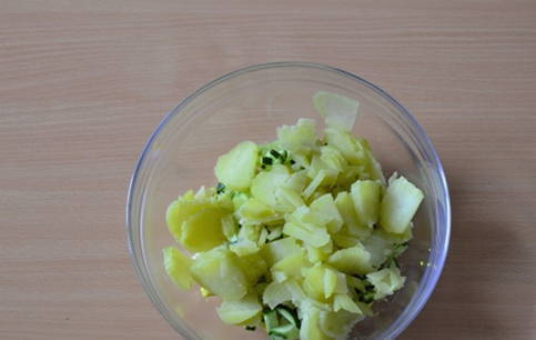 Snijd gekookte aardappelen, radijs en komkommer in kleine blokjes.