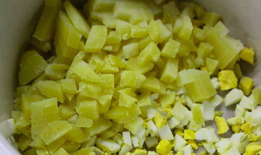 Kook aardappelen en eieren voor, laat afkoelen en snijd in blokjes.