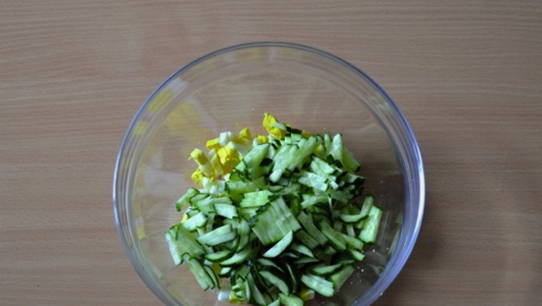 Was komkommers en snij in reepjes. Breng alle gehakte ingrediënten over naar een grote kom.