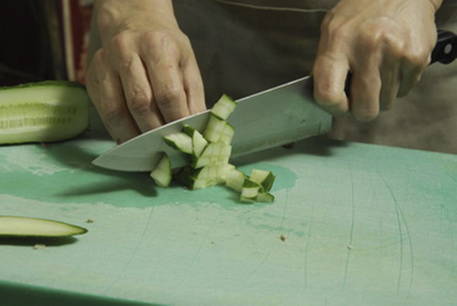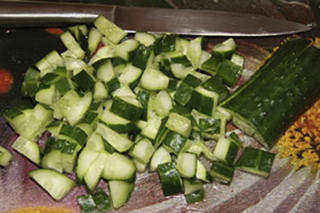 Was de komkommers, als de schil bitter is, snijd deze dan af. Snijd de groente in blokjes.