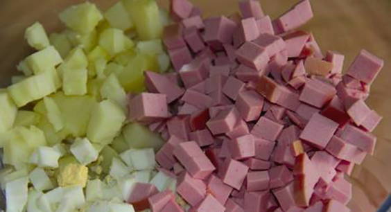 Snijd de worst en de gekookte eieren in kleine blokjes.