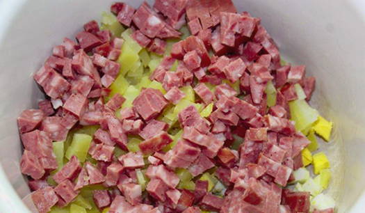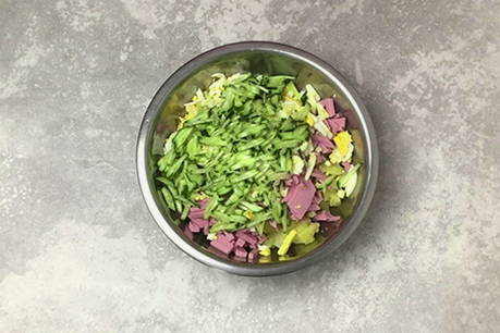 Snijd de worst in kleine blokjes of reepjes, voeg deze toe aan de rest van de ingrediënten.