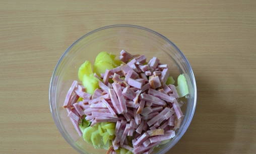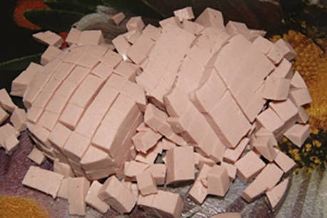 Snijd ham, gekookt rundvlees en kip in kleine blokjes.