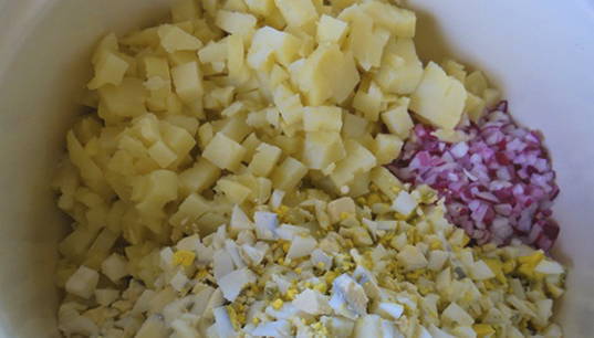Kook aardappelen en eieren tot ze zacht en afgekoeld zijn. Snijd aardappelen, eieren en radijs in kleine blokjes.