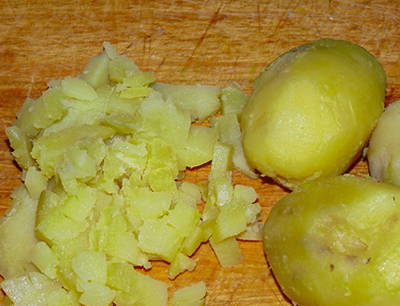 Kook de aardappelen in de schil, koel af, schil en hak ze fijn.