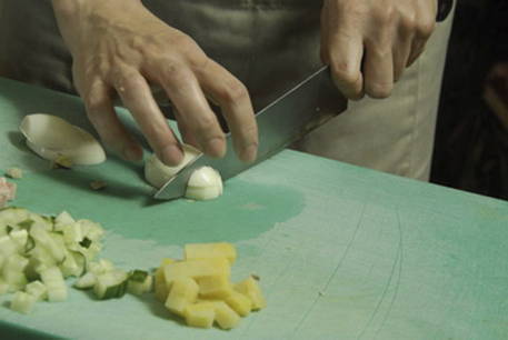 Snijd ook de uien en komkommers.