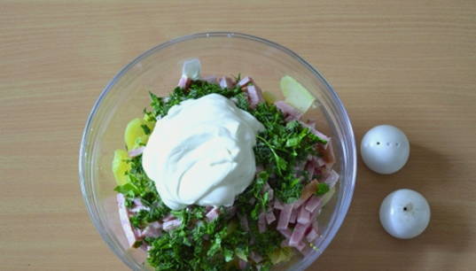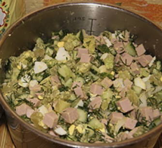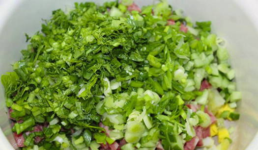 Meng vervolgens alle ingrediënten met de gekoelde dressing, zout naar smaak en de okroshka is klaar.