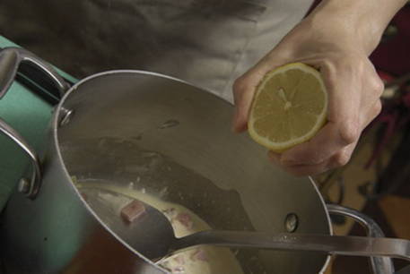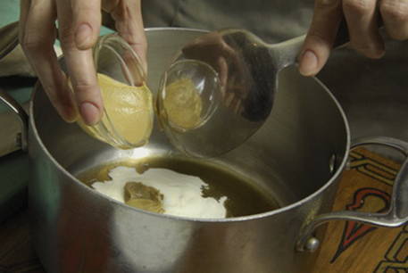 Voeg kwas en zure room toe, roer.