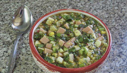 - Aromatische okroshka op kwas met rookworst